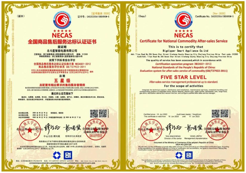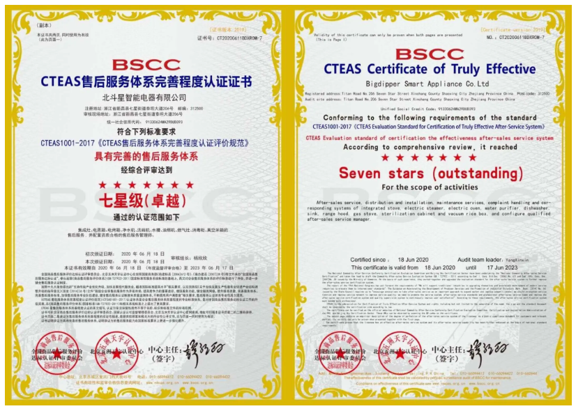 2020年6月,歷經(jīng)嚴格審核,北斗星集成灶從眾多品牌中脫穎而出,榮獲售后服務認證中的“五星級售后服務認證”和“七星級(卓越)售后服務體系認證”雙認證。這意味著北斗星售后服務質(zhì)量達到了國家最高標準,樹立行業(yè)服務標桿!