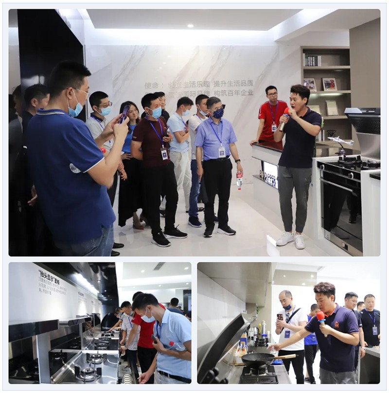 接著,參觀團(tuán)到達(dá)北斗星公司展廳,工作人員為大家講解了“漂亮得不像實(shí)力派”機(jī)王A6,以及北斗星家族產(chǎn)品標(biāo)志性的創(chuàng)新特性——“天一無縫,就是好擦”的一體式無縫臺面,擦洗無死角,就是好清理!現(xiàn)場爆炒辣椒演示,油煙一秒吸凈,近距離也不嗆,更為直觀地向大家展示北斗星集成灶的完美使用性能。