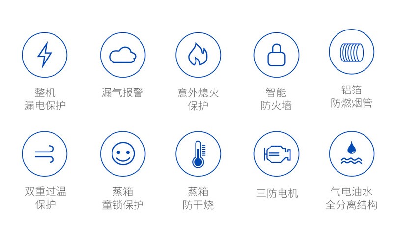 北斗星一直將用戶安全放在首位,為了保證機器安全運行,設置了十重安全保護:包括智能防火墻、漏氣報警、意外熄火保護、氣電油水全分離結構、蒸箱防干燒、蒸箱童鎖保護、三防電機、鋁箔防燃煙管、雙重過溫保護、整機漏電保護。這十重保護時刻保證機器穩定運行,讓用戶安心又放心!